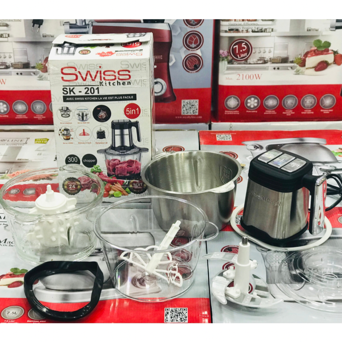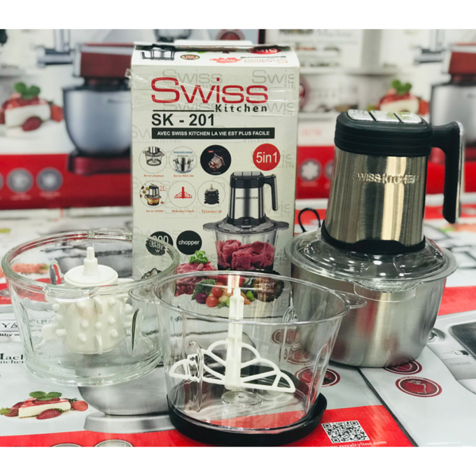 اشوار سويس كيتشن بعدة أكسسوارات راح يهنيك من تعب الكوزينة لتوفره علي عدة أكسسورات و صناعته المتقنة بأربع شفرات حادة و مسننات حديد في حديد ليدوم أطول مدة ويتحمل العمل المستمر لأطول فترة ممكنة